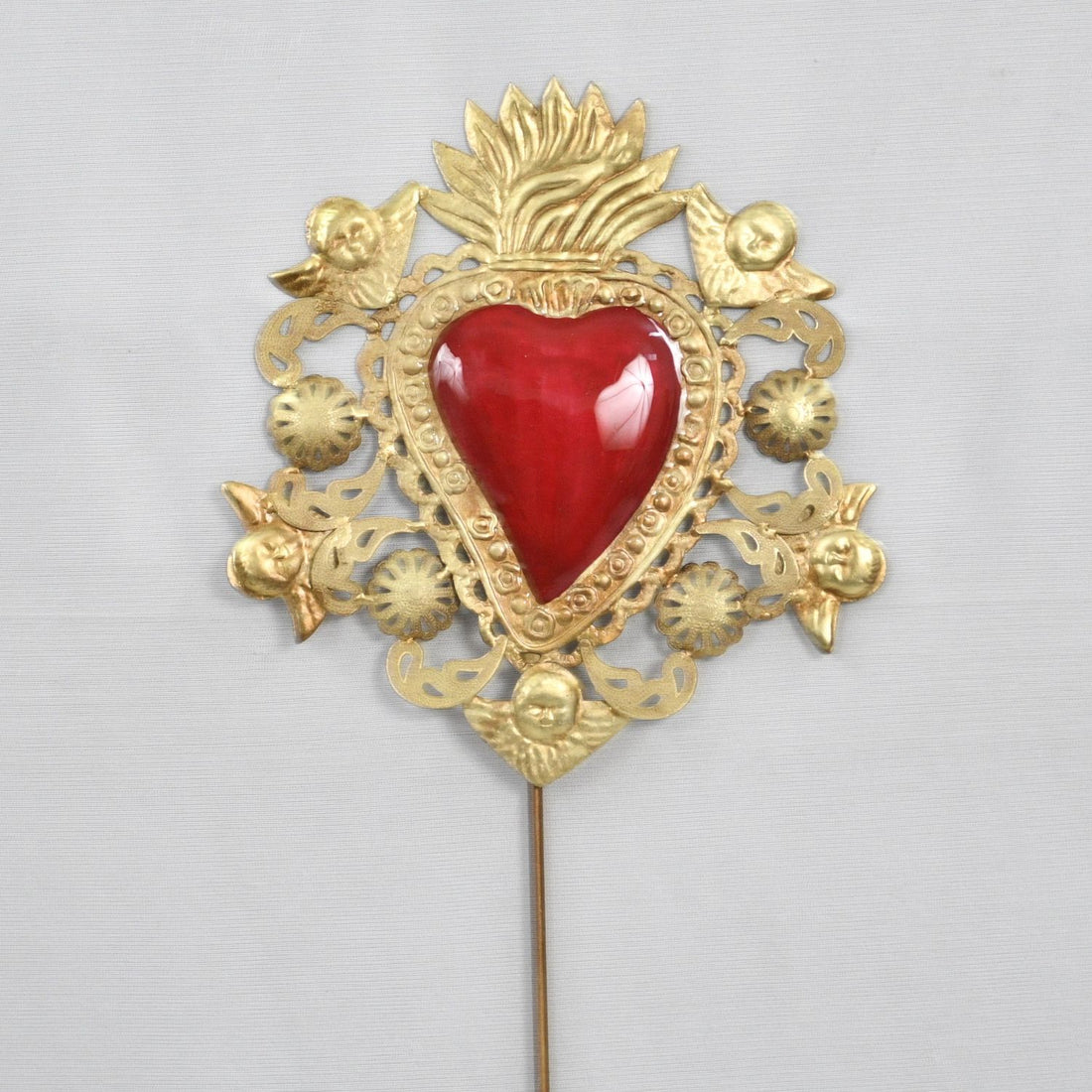 An intricately detailed ex-voto heart sits atop a distressed green stand, blending vintage charm with...