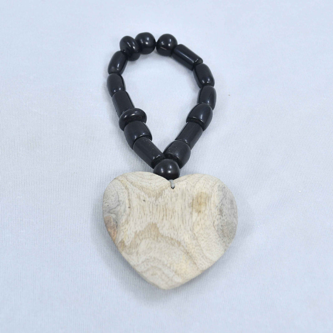 This charming strand of antique wood beads showcases a lovely heart pendant, bringing rustic charm...