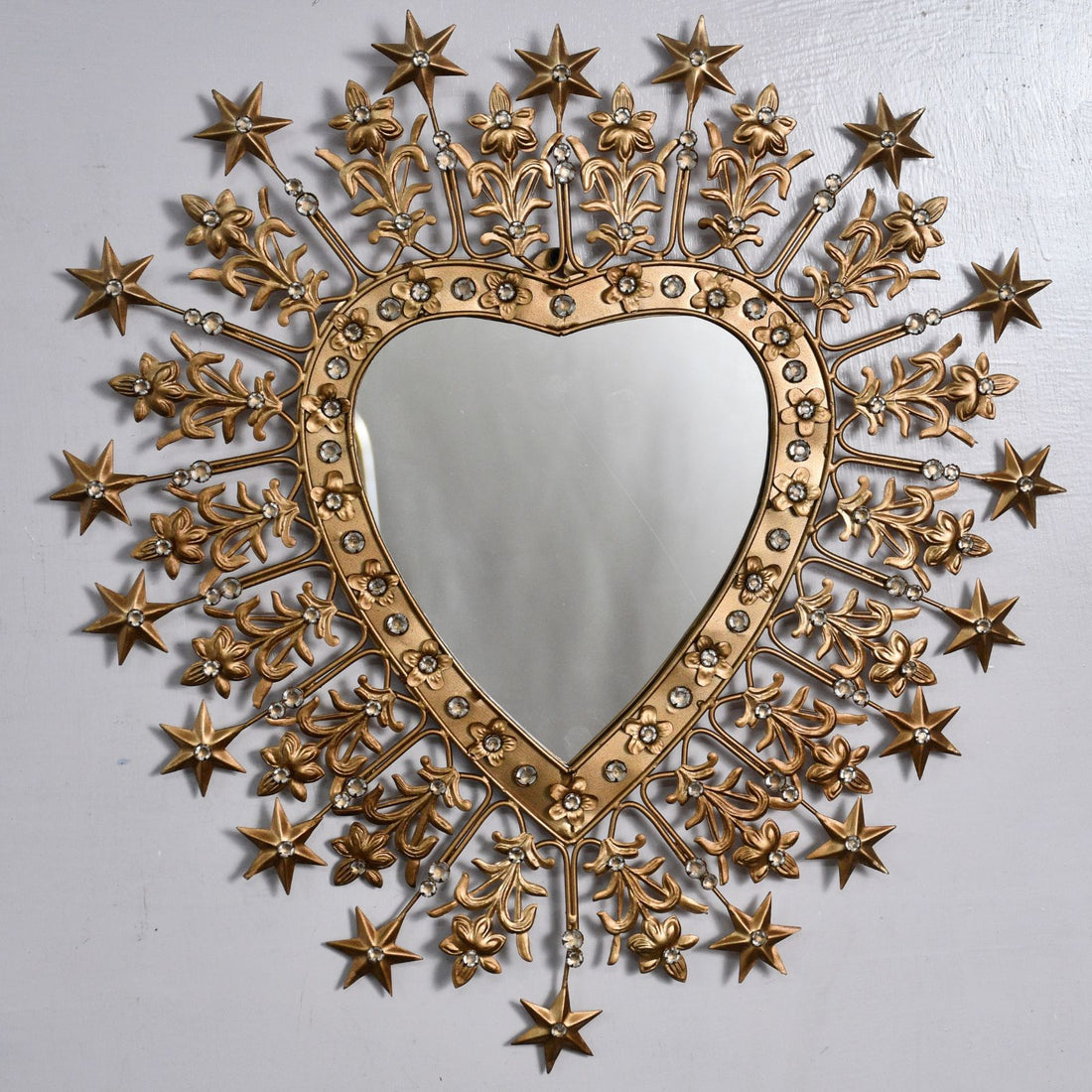 Handcrafted from metal with an antiqued gold finish, this bejeweled mirror captures and reflects light...
